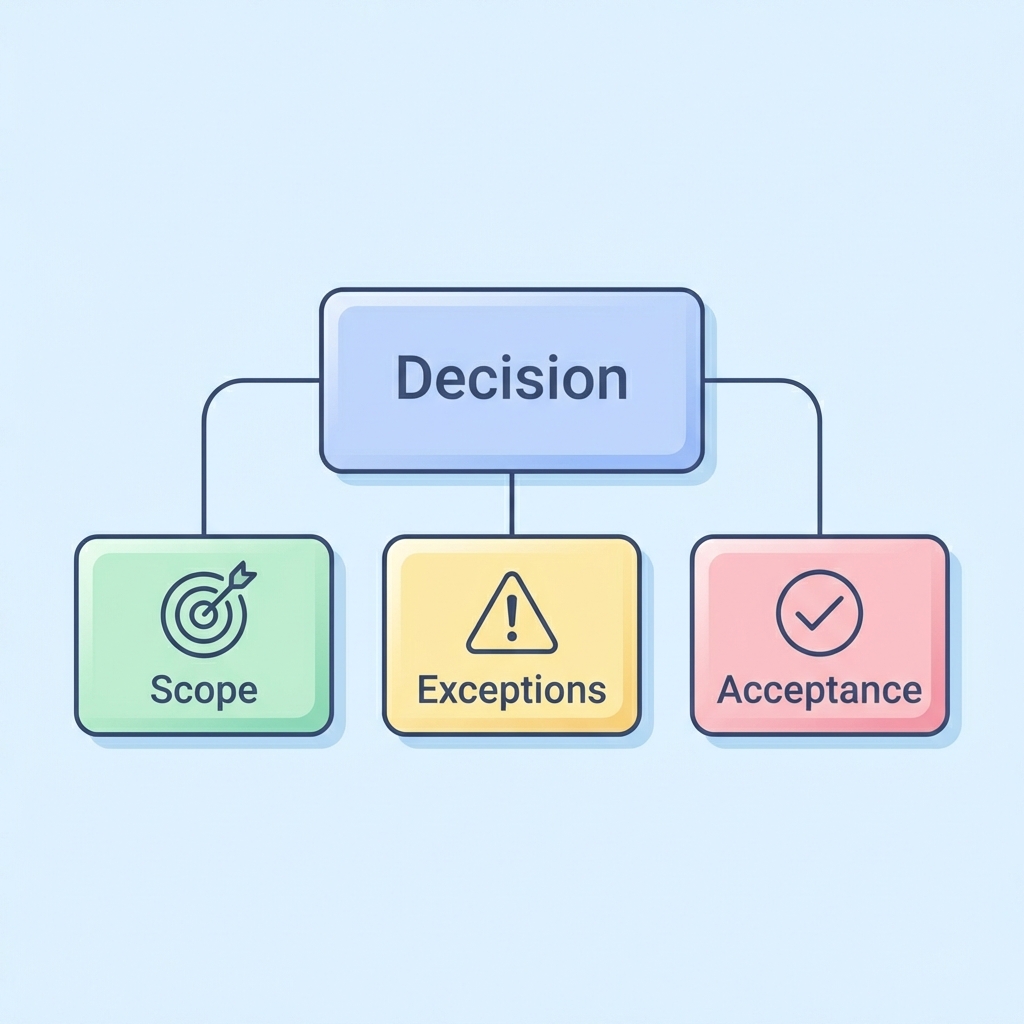 このDecisionのスコープ(適用範囲)と例外(適用しない条件)を3つずつ提案して。